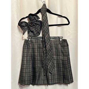 This school girl costume set, excluding the shirt, includes a pleated plaid skirt, matching tie, bow, and black thigh-high stockings. Ideal for themed events.