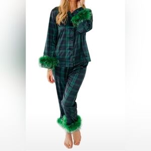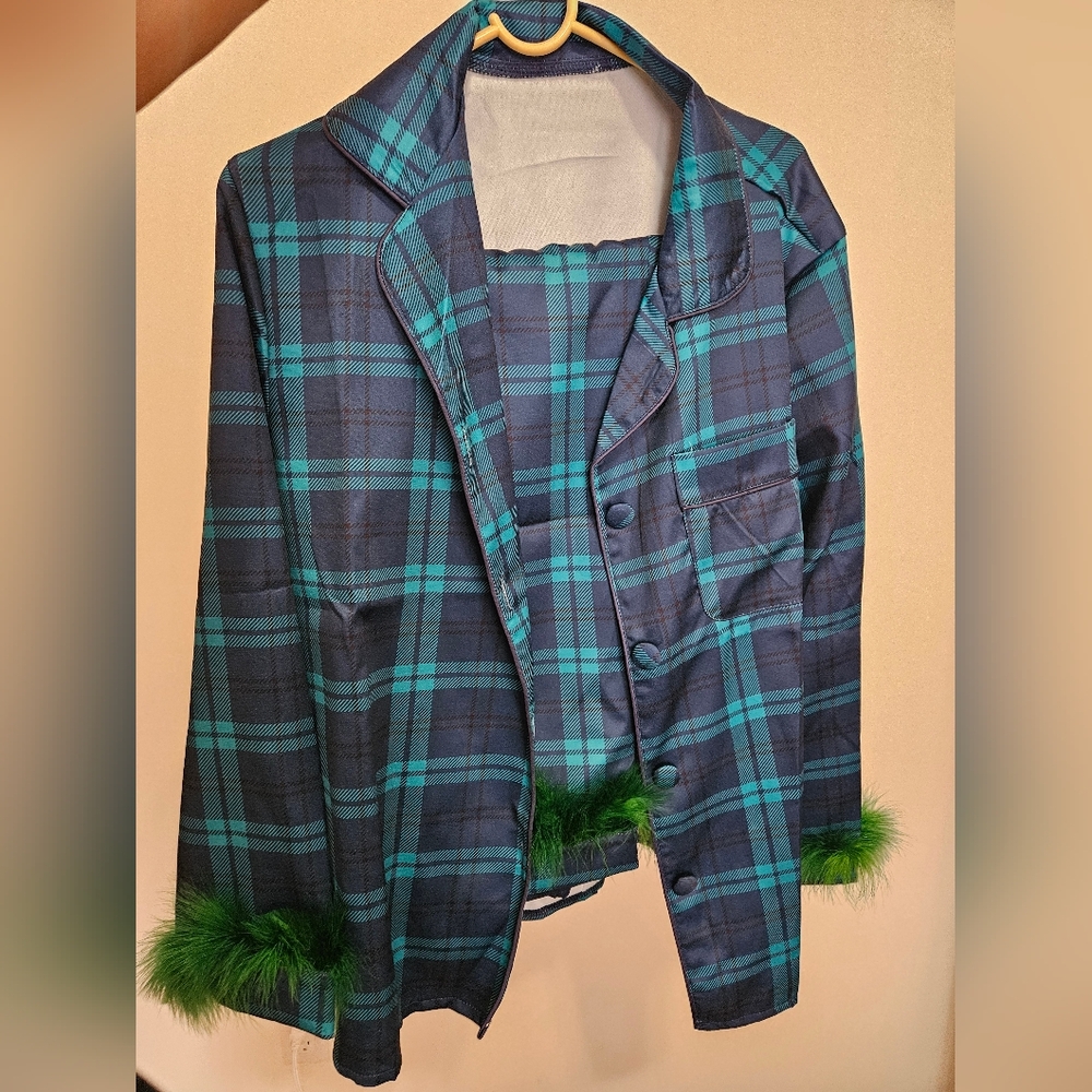 Stylish plaid jacket featuring green fur trim. Perfect for a bold look. can be used out or as PJS New, never worn