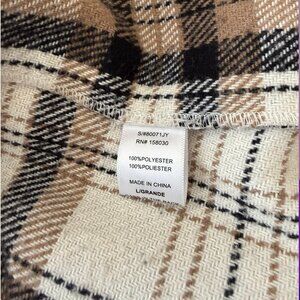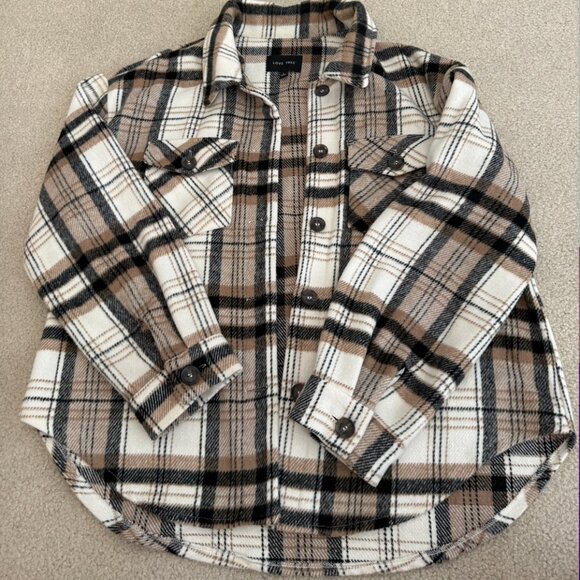 Brown, black, and white flannel/plaid shacket. Used but in good condition. Buttons are in tact and there are no stains or marks. Size large from Love Tree. Nice heavy, thick material to keep you warm!