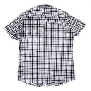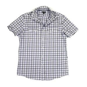 Apt 9 plaid button up top, short sleeves, purple and white, unsure if this is men’s or women’s, displayed on women’s size medium (8-10) dress form, good preowned condition