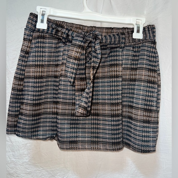 Style: Casual plaid skirt. Tied waist band. Waist is a little tighter more on the small side. The back shows the shorts and the front shows the skirt.