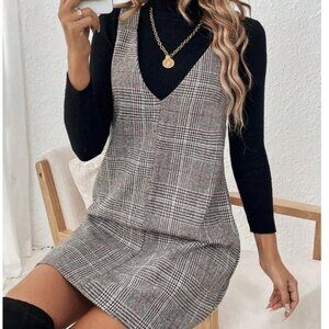 Trendy plaid sleeveless mini dress featuring a flattering V-neckline and relaxed fit. Perfect for layering with turtlenecks or long-sleeves during fall or winter.
