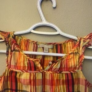Vibrant plaid sleeveless top perfect for casual outings. Features a mix of red, yellow, and orange hues. Lightweight and comfortable for all-day wear.