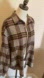 Stylish plaid button-up shirt jacket (Shacket) with a classic collar. Features a mix of brown and cream colors. Silver/light gold snaps. Sleeves have a feminine pleating and snaps at the wrists. Oversized fit size small. Purchased at khols