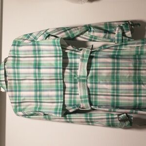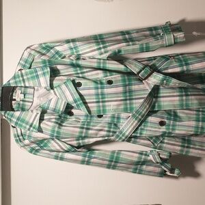 Beautiful raincoat for sale. Brand name: Macy's On 34th. Primary colors are green and white, with a little pink and blue. Size available: 1X.