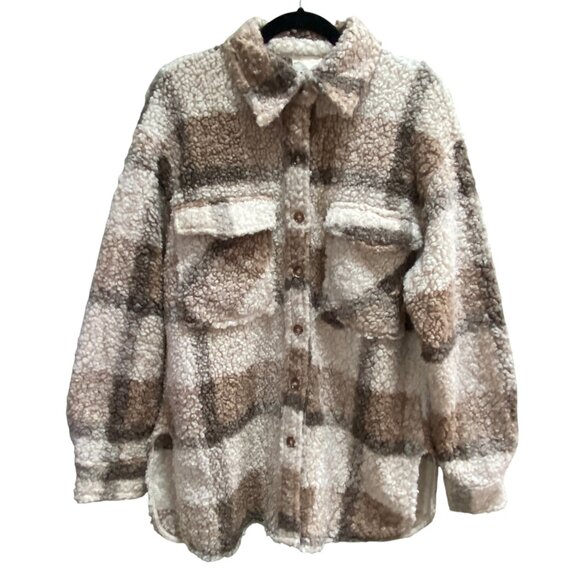Plaid Teddy Sherpa Shacket Wm Sz M Brown Shirt Jacket Oversized Country Western