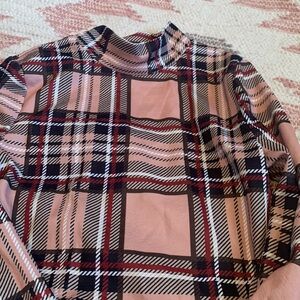 From SHEIN runs small. It’s a small but I think it fits more like an xSmall or even XXS. Shine apparence maybe polyester. Stretchy fabric. Colors are: red, brown, rosy peach, white, black. Looks brand new.