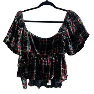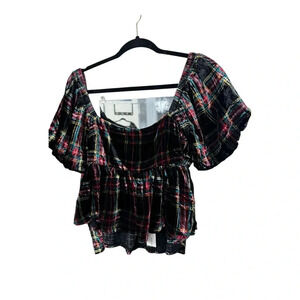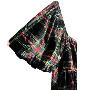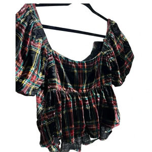 Plaid Velvet Bow Back Blouse Square Neckline w/ Puff Sleeve Baby Doll Top NWT