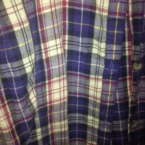 WILLING TO NEGOTIATE!! Purple/pink/white/yellow plaid button down shirt. Good with a tank under it or without. It's a XL but does run small. I'm a L and it does not fit me. Worn maybe 3 times.