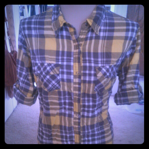 Yellow/gray/white plaid shirt. Snap buttons. 3/4 length sleeves. Size 1x