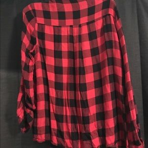 Red and black plaid button down. The picture doesn't really do it justice, it's redder than it appears in the photos.