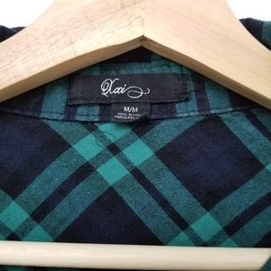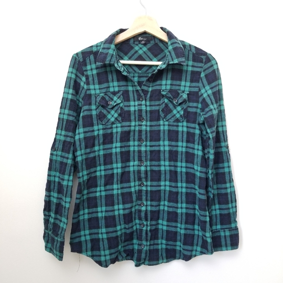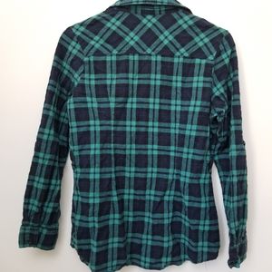 Teal and navy lightweight button down. In good used condition. Great for layering in the summer. Buttons for keeping sleeves rolled up.