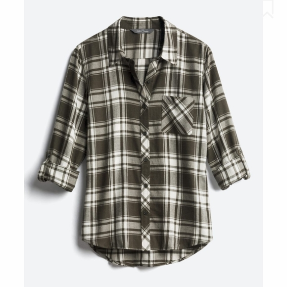 Greyish/green and white plaid button down shirt. Decent shoulder room, doesn't pull. Comfortable, good basic piece, good quality. Only worn a few times. Market and Spruce