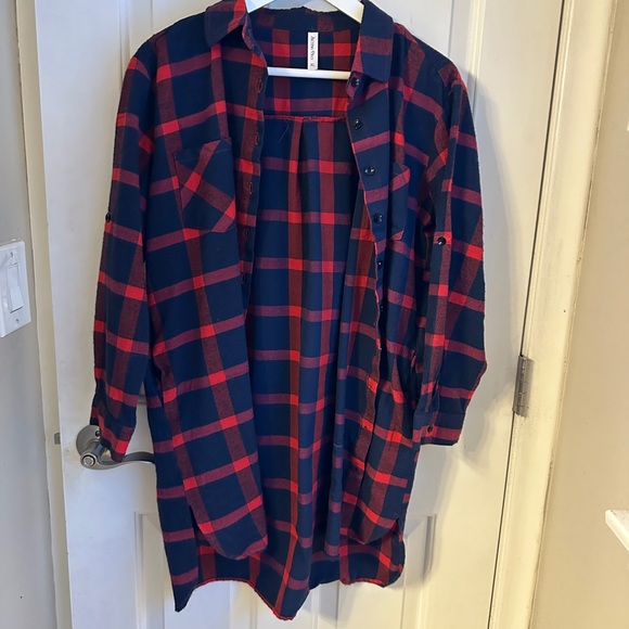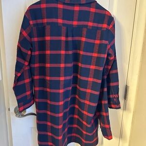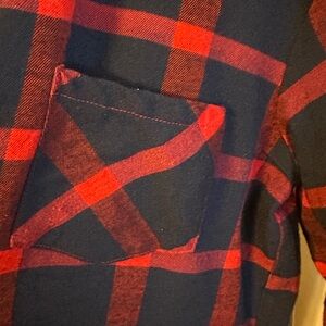 Size XL but runs small. Blue and red plaid button down. Super cute with jeans or leggings. Size XL. Never worn
