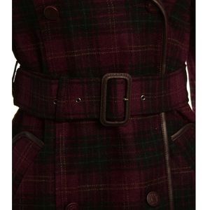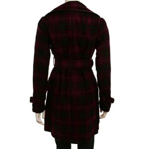 Double breasted button down coat. Side slit pockets. Buckle waist belt. Fully lined. Shoulder to hem: 35", sleeve length 25.5", shoulder width 15". No size tag, fit size S or 2/4.