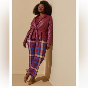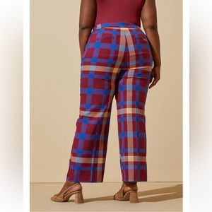 Plaid woven straight-leg pants with two welt pockets at front and two welt pockets at back. Concealed hook and zip fastenings at front. Inseam: 31".