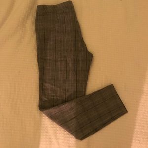 Super stretchy plaid pants. Mostly grey, but had a thin line of blue throughout the pattern.