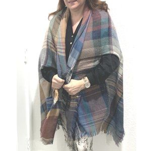 Multicolor Plaid Open-Front Poncho with Pockets – Oversized Wrap Cape