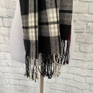 Plaid winter scarf black white & red w/end fringe 63.5”x12”