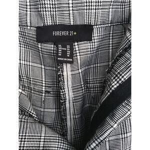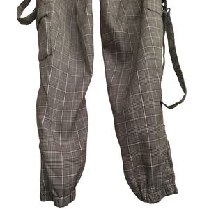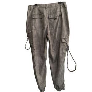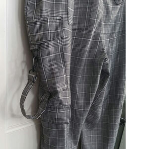 Forever 21 brand black gray white plaid thin stripe woven lightweight unique pants pockets cargo style but offset one higher than the other the other one's lower they have straps attached to each pocket for fun used grunge, very steampunk Vibe,skater, blokecore. In good pre-owned condition. Size X large/ xx-large