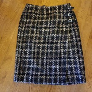 Wrap around plaid pattern skirt with leather buckles. Fully lined, boucle thick material. Excellent for fall and winter with boots or tights! Excellent used condition.