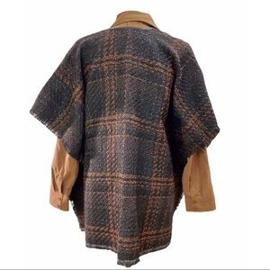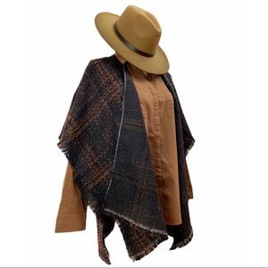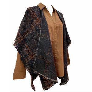 Plaid Black Brown Textured Open Front Fringe Trim Poncho - NEW