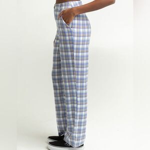 Plaid Pants. Button front with belt loop waist and zipper fly. Wide leg fit. All over plaid pattern. Approx. inseam: 30". 65% Polyester 30% Rayon 5% Spandex. Machine wash.