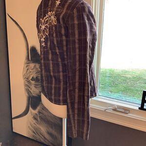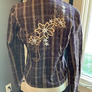 Nicely detailed, brown and cream plaid jacket with embroidered details to front and back of jacket. Single button closure. Poly/cotton/elastane blend. Size medium.
