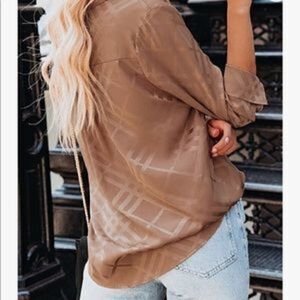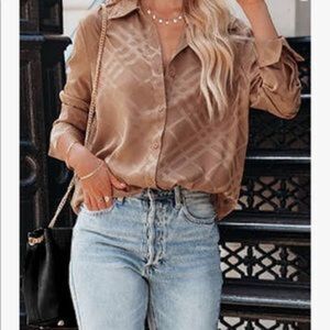 Plaid Khaki Button Down Satin Shirt With Roll Up Sleeves