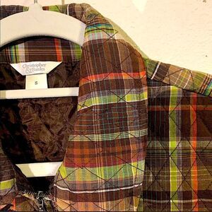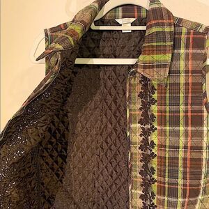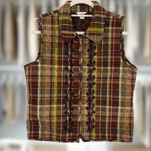 Quilted plaid vest with floral embroidery down both sides of zipper and brown lining. Great vest looks brand new, gorgeous for year round wear - awesome color scheme with lively neon orange and green diamond quilted tartan.