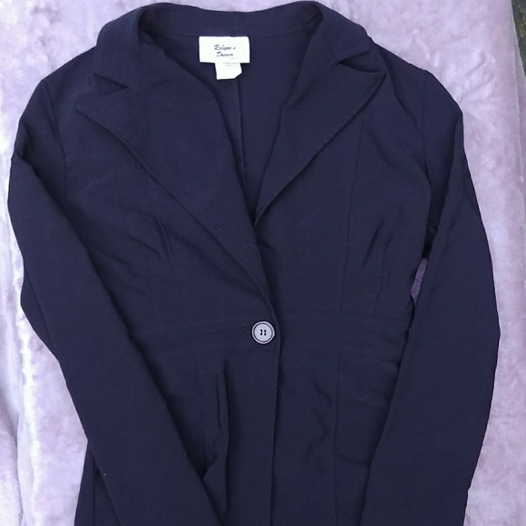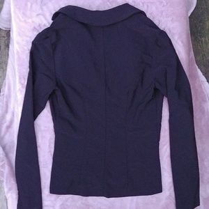 Plain black blazer, single button. Size Small. Tailored in front and back. Has some stretch which makes it super comfortable. Dress it up or down. No signs of wear.