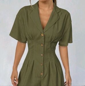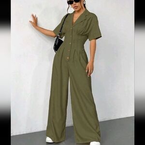 Plain Front Button Closure Short Sleeve Casual Pleated Jumpsuit