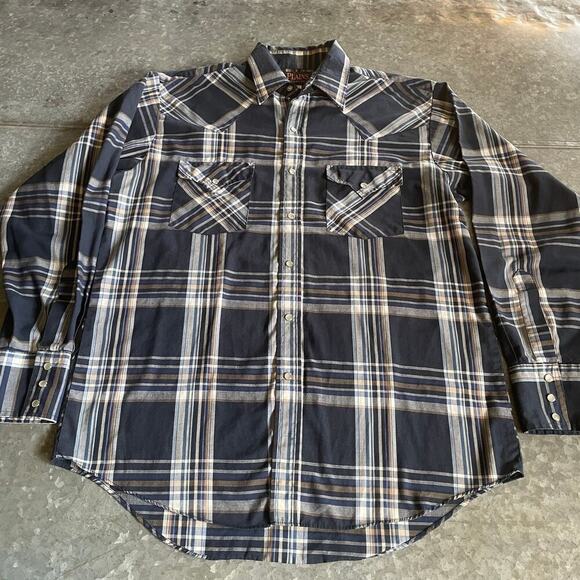 Plains Western Wear Pearl Snap Button Shirt Mens Medium Blue Plaid Vintage 90s