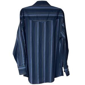 Classic vintage-inspired Plains Western Wear long sleeve shirt in black with blue and gray stripes. Features pearl snap buttons, pointed yokes, and double chest pockets for authentic cowboy style. Great for rodeo, concerts, or casual wear.