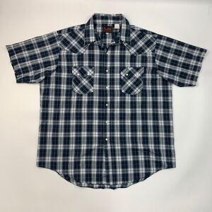 Plains Western Wear Shirt Mens XL Navy Silver Pearl Snap Button Plaid Cowboy