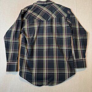 Plains Western Wear Snap Front Plaid Shirt Medium Black Olive Maroon Pearl Snap