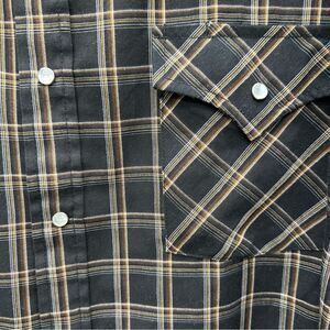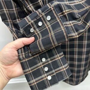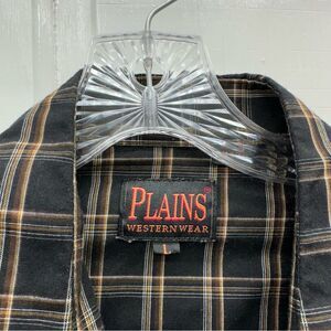 Plains western wear pearl snap button down long sleeve shirt men's large. black with brown stripe white/pearl snaps