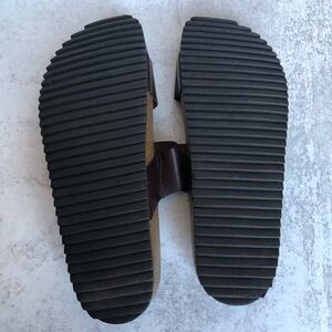 Comfortable brown leather slide sandals with a cork sole. Perfect for casual wear.