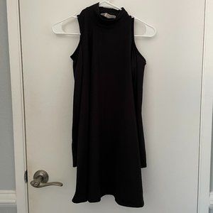 This is a loose-fitting black tunic dress with cut out shoulders. Super soft fabric. Like new. Size S.