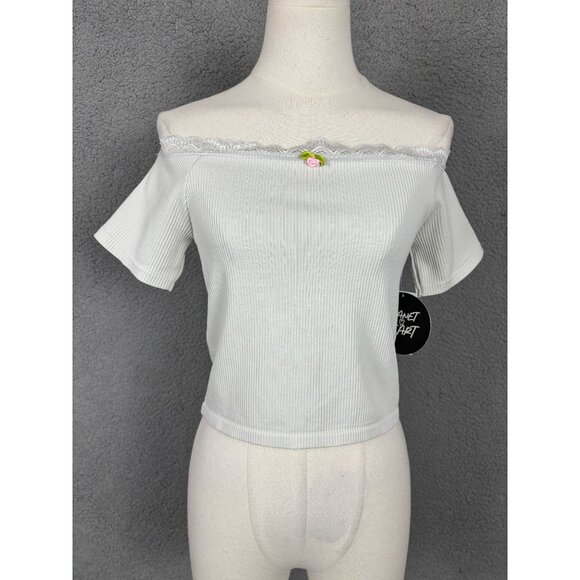 Planet Heart Juniors' Cropped Gray Off-Shoulder Ribbed Lace Trim Top Large NWT's