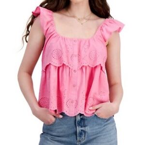Charming pink blouse with eyelet details. Features ruffled sleeves and button front.