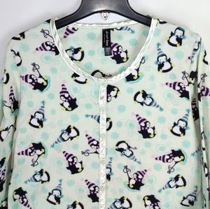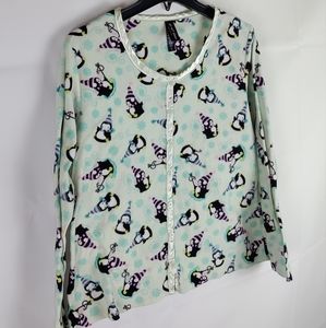 Very soft pajama shirt. Gently worn, no noticeable flaws. Penguins printed all around. Button-up.