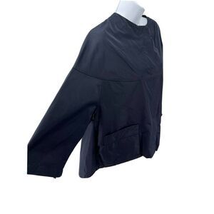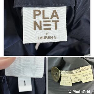 Planet by Lauren G Size 1 which is a size 4-8 US. Navy Blue Jacket 100% Nylon. Boxy, Button Pockets. Made in the USA. Extra button still attached to the inside jacket. Measurements in photos. Very good pre-owned condition. No holes or stains. Small stitch on pocket came loose and button hole has sting in middle of it but button still functions. See photo third to last. You could chose to cut the thread out you can. Comes from smoke free environment.
