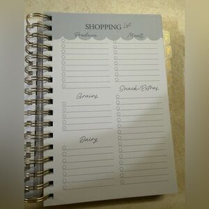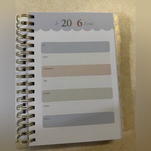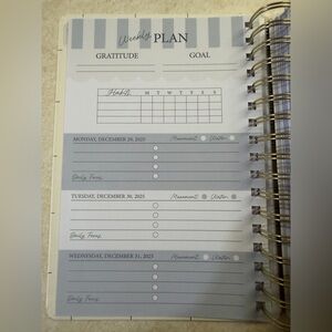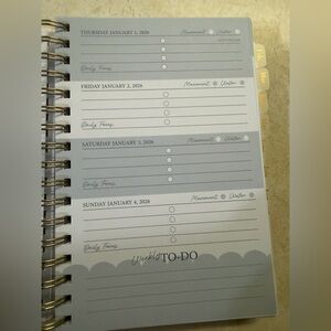 New 2026 Planner from Happy + Healthy Planner. Includes monthly calendar, habit tracking, gratitude tracking, meal planning and grocery list pages, and several notes pages.