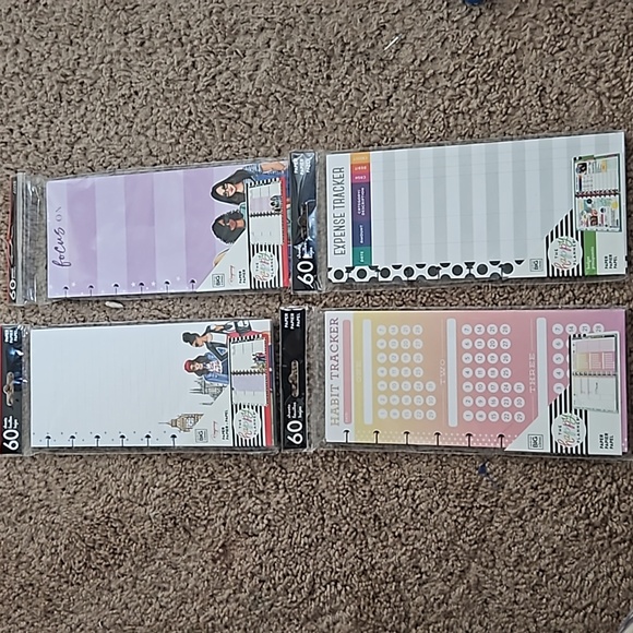 SEMI USED planner inserts. expense tracker, focus on, blank lined papers with graphic on bottom, and habit tracker. Some sheets are gone in the packages. there is NOT 60 sheets in each packet. can fit classic planner