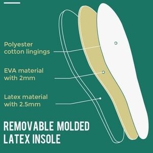 These solid white (there are some reflective colors in some of my pics of these, they are WHITE, no discoloration) short rain boots have elastic on sides, tight-grip soles, triple layered sole for comfort, back straps for easy on/off and breathable polyester &cotton linings for comfort.