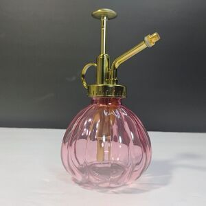 Charming pink and gold glass flower mister with vintage-inspired metal pump and handle. Ideal for gently misting plants or adding a touch of elegance to your plant shelf. Estimated to be contemporary in age, the piece reflects a mix of Bohemian and Victorian style with functional flair. Compact and stylishmakes watering feel like a ritual.