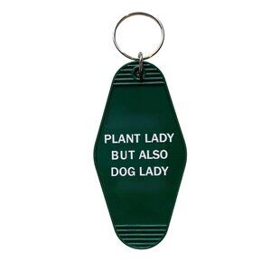 Green keychain reads: PLANT LADY BUT ALSO DOG LADY in white lettering.