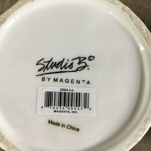 Cream planter with beige red color scrolls floral raised pattern: 5” tall, 5 1/2” diameter at top, 3 1/2” diameter at bottom. By the spring shop was $9.99 new.
