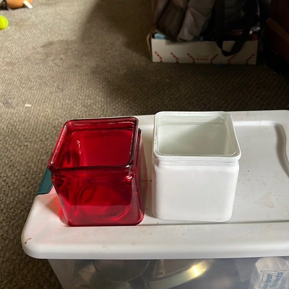Two new square containers One ruby red and I frosted white No chips or cracks Never used Made in ankron Ohio